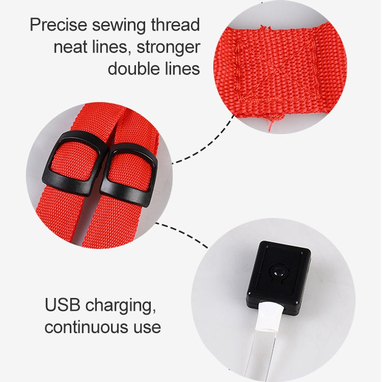 1. Alimentation LED: 4 boutons de cellule CR2016. 2. 3 modes d'éclairage: allumé en continu, clignotement lent, clignotement rapide (avec interrupteur pour sélectionner) 3. Matériel: nylon 4. Taille: XS / S / M / L / XL
