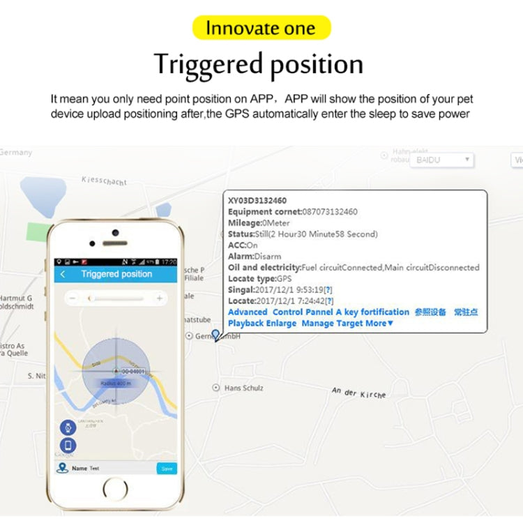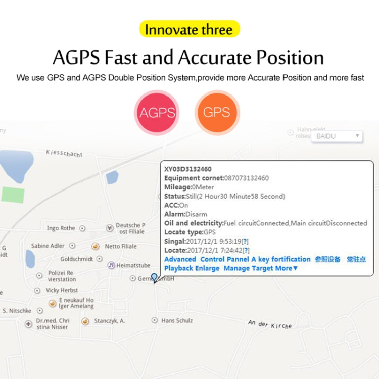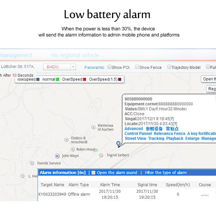 1. Suivi en temps réel. 2. Alarme de vitesse / faible puissance. 3. Alarme de mouvement. 4. Dans / hors alarme Geo-barrière. 5. IP67 étanche. 6. Position de l'appel nominal. 7. Économisez de l'énergie et du GPRS. 8. Mode SMS longue veille 12 jours. 9. Fonction AGPS, recevez les signaux GPS plus rapidement. 10.Mémoire de stockage intégrée, téléchargement de données de zone aveugle. 11.APP ensemble.